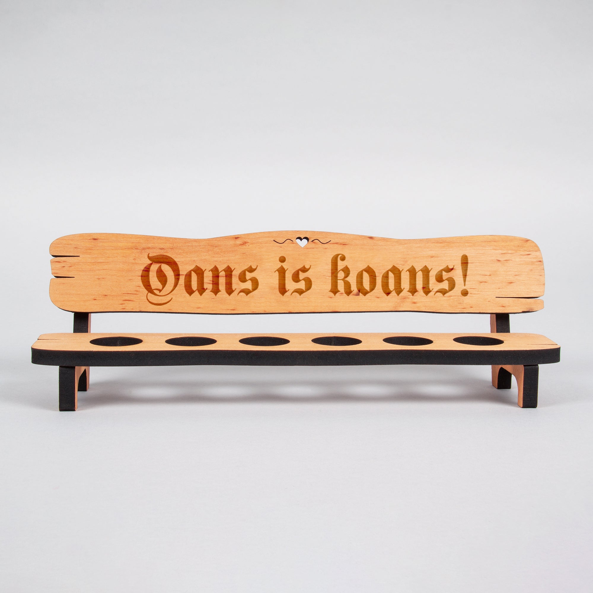 Die haltbare Lasergravur auf der Rückenlehne zeigt über die ganze Breite den Text in Frakturschrift "Oans is koans!".